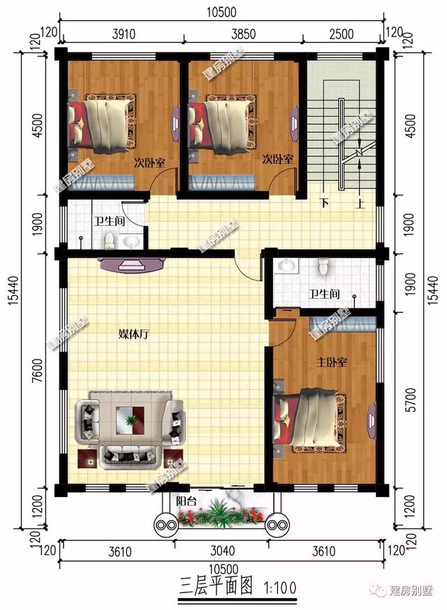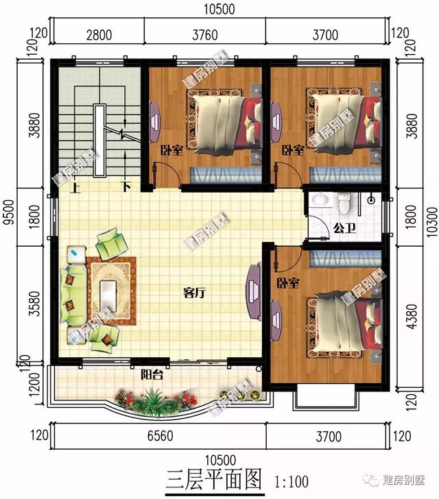 三层:有三室一厅两卫,主卧带独卫,外配生活阳台