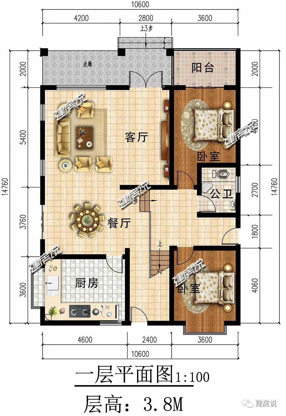 一层:入门是宽敞客厅,方便接纳亲朋好友;厨房与餐厅相连,用餐便利;设有2间卧室;一动一静,布局合理。