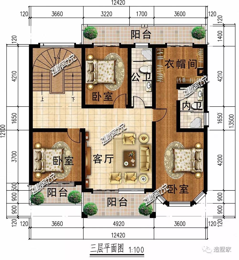 三层:布局与二层基本一致,设有3个卧室,一个客厅。