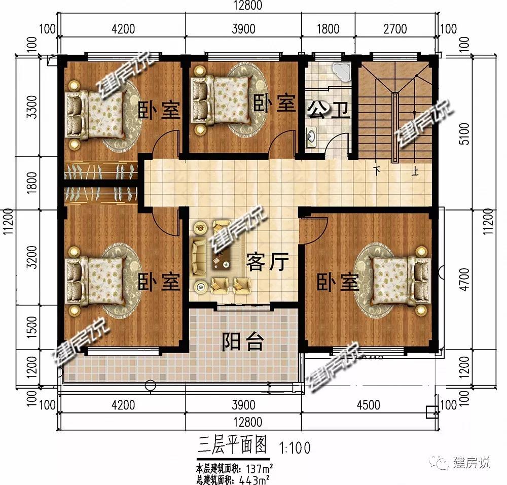 三层:卧室设置充裕,居住无忧;阳台面积宽敞,利于通风与采光;客厅便于家人之间联络感情。