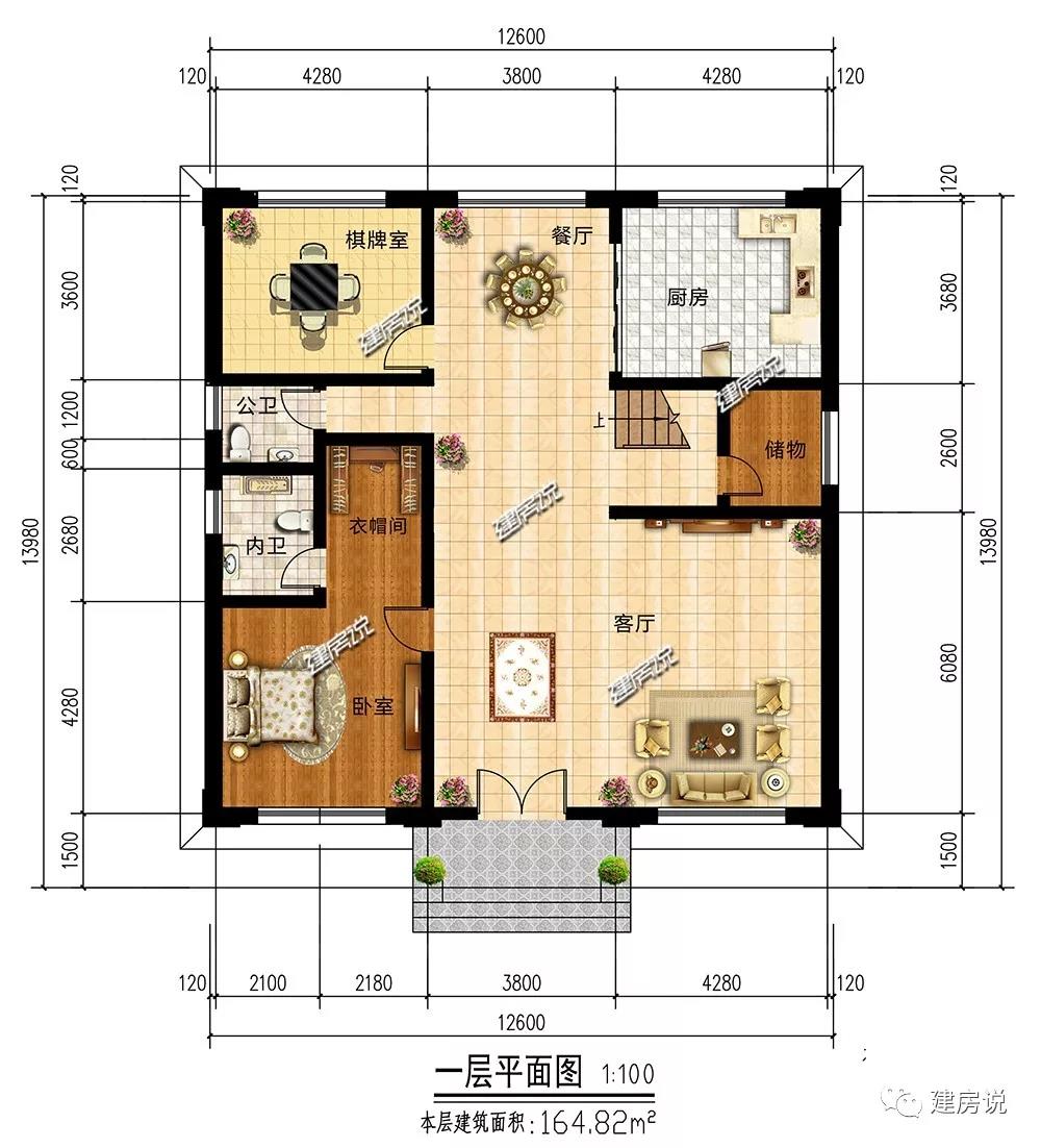 一层:设有1间卧室,适合当老人房;设有棋牌室,供家庭娱乐;厨房与餐厅相连,干净卫生;宽敞客厅,供家人沟通感情。