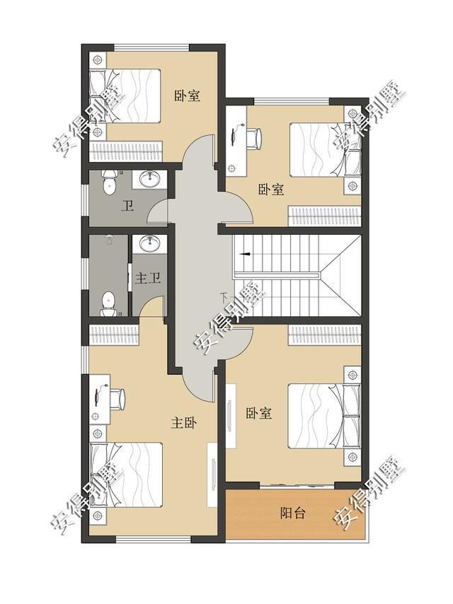 二层为卧室区域,1间主卧套房,3间次卧,朝南大阳台。