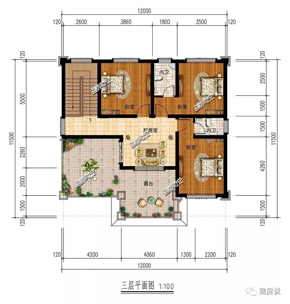 三层:设有3个卧室,主次分明;露台超大超宽敞,晒被子衣物超方便,摆上小椅子,来个美美的下午茶。