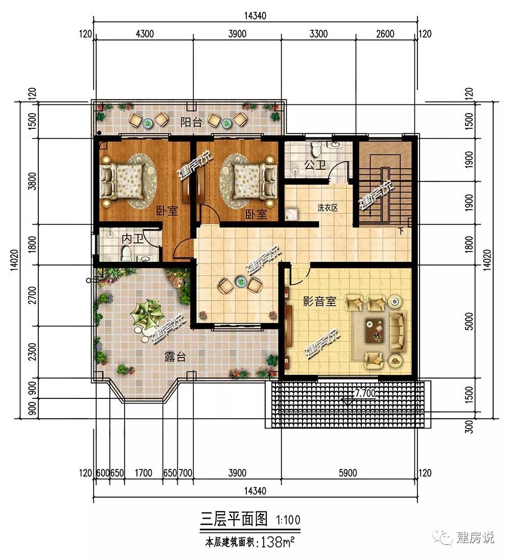 三层:2个卧室主次分明;影音室的设计,丰富居家生活;露台面积宽敞,观景晾晒两不误