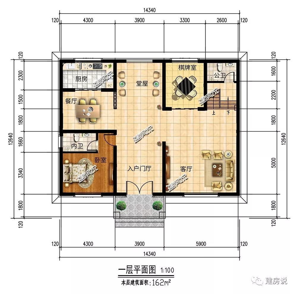 一层:堂屋的设计很接地气;厨房、餐厅划分在一侧,布局合理;棋牌室为亲戚朋友提供更多娱乐活动。
