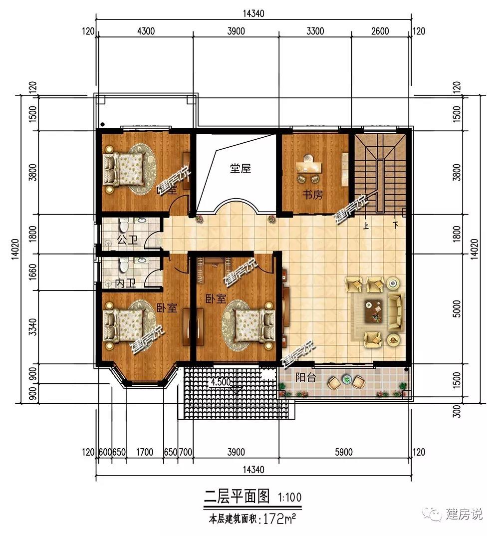 二层:3个卧室主次分明;书房为学习、办公创造良好的环境;客厅外的阳台设计,利于通风采光、舒展身心等。
