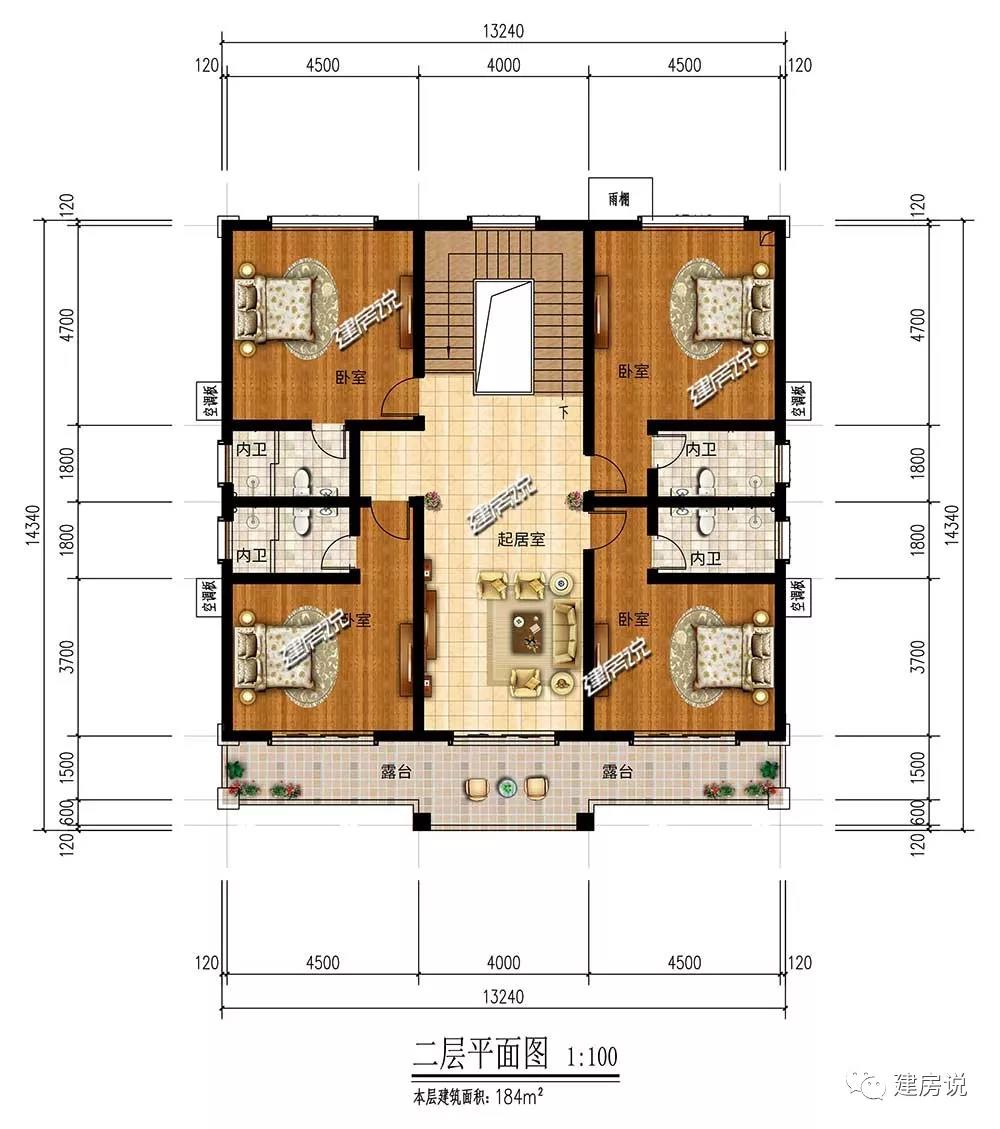 二层:设有4间卧室,大小合理;起居室方便家人沟通感情;宽敞露台可供晾晒