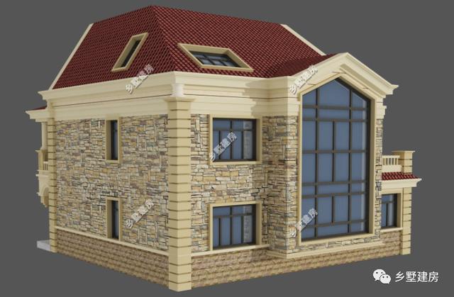 这是一款三层欧式别墅,外观优雅美观,外墙主要用文化石装饰,文化石近几年比较流行,有一种复古原始的美感。多阳台的设计实用的同时也更有层次错落感,双扇对开大门也显得大气十足。