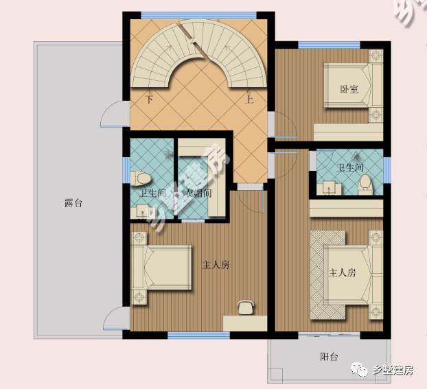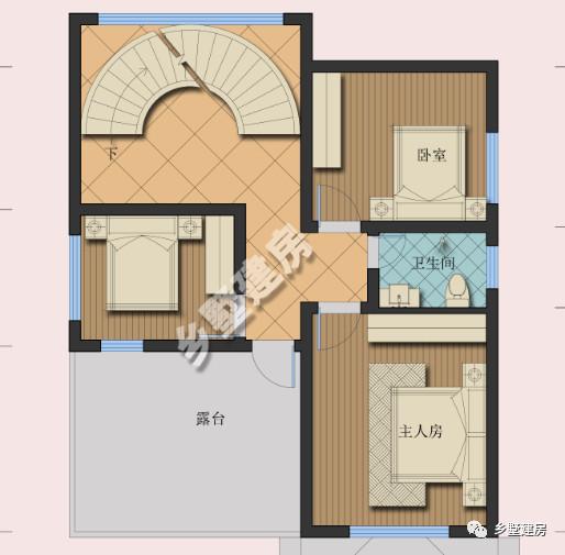 二层为休息区,设计了三间卧室,一个大露台。