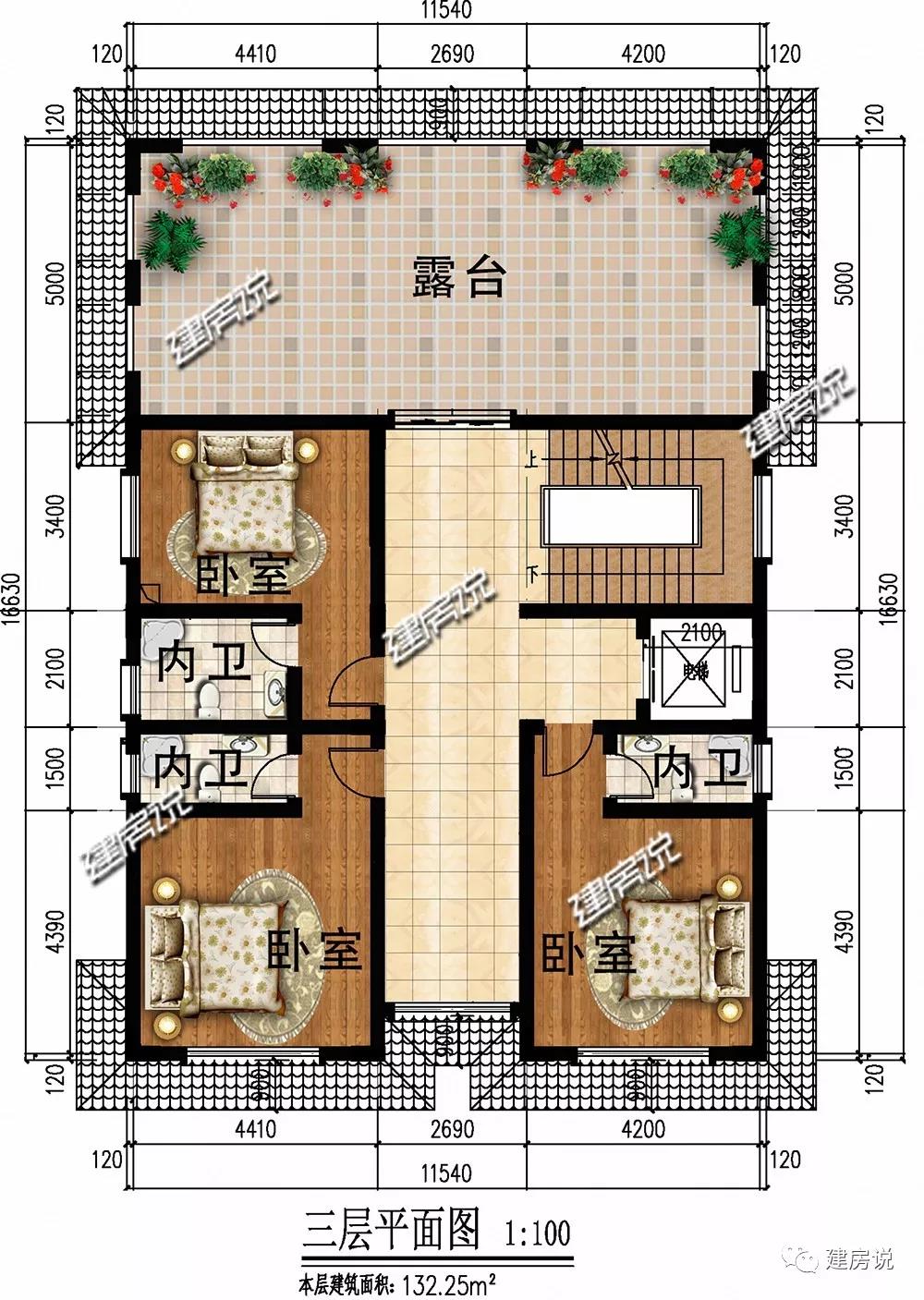 三层:设有3间卧室,主次分明;宽敞露台可供晾晒,养殖花草等。