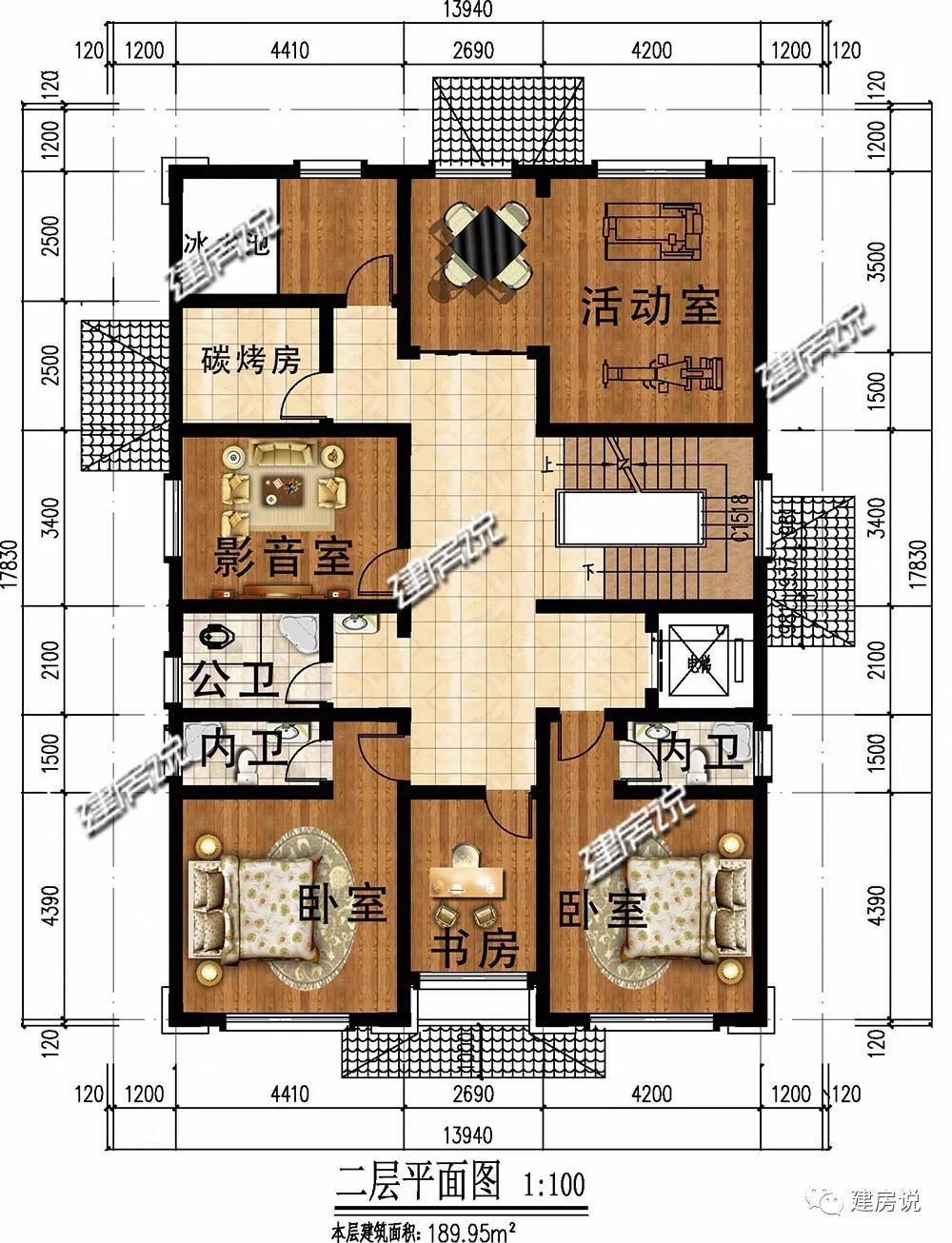 二层:设有2间卧室;书房给家里添加书香气;影音室,活动室给家人提供娱乐活动空间。