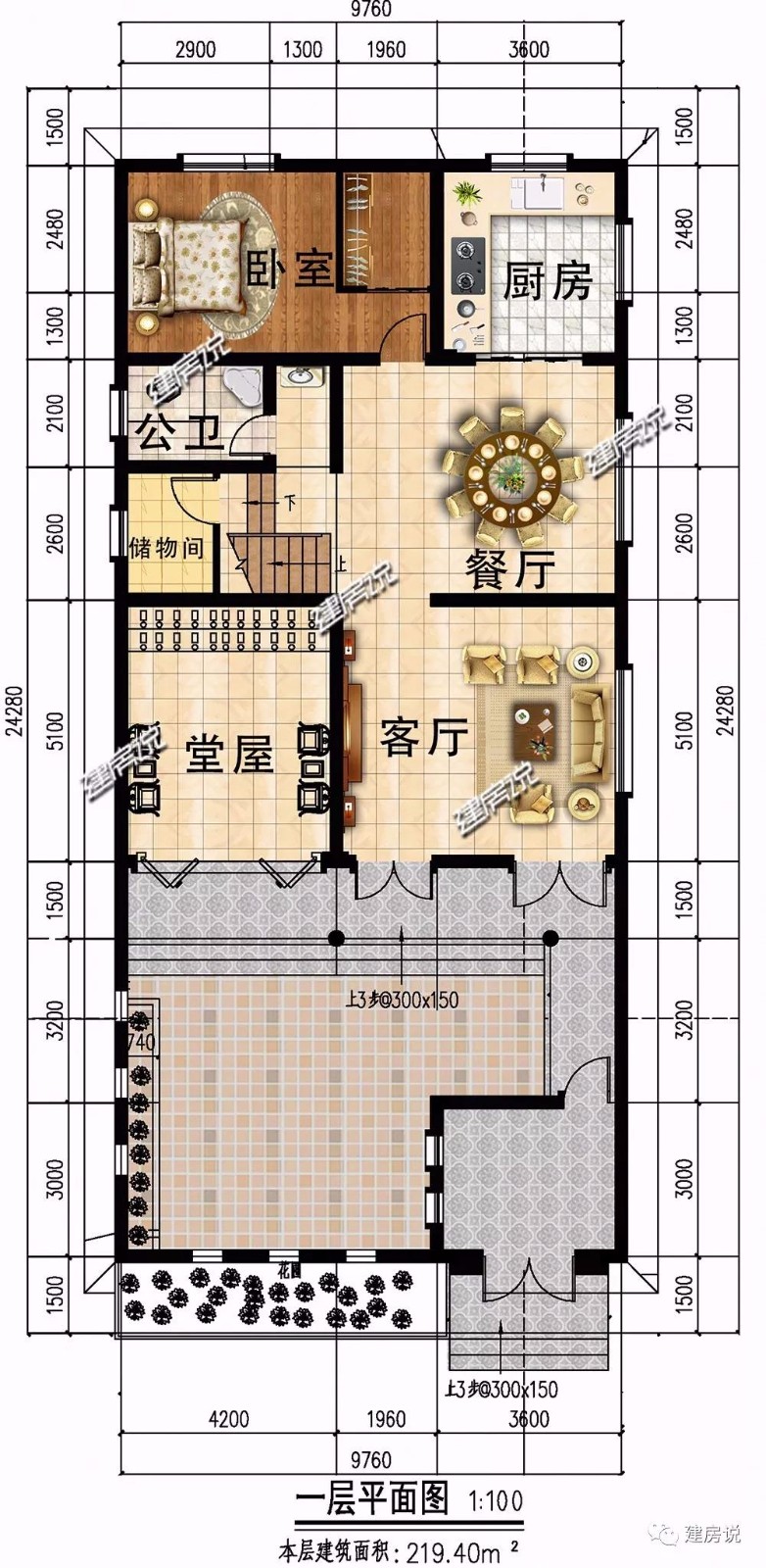 一层:大大的庭院,可以种种花花草草;设有一个卧室,可以做老人房,方便老人起居;设有堂屋,符合乡村生活习惯;厨房餐厅相连,干净卫生。