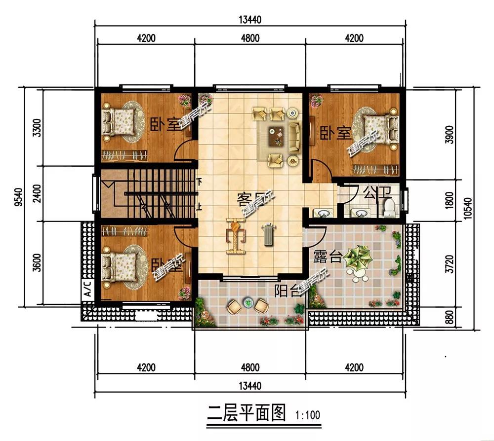 二层:设有3个卧室;露台让观景晾晒两不误;客厅便于家人之间联络感情。