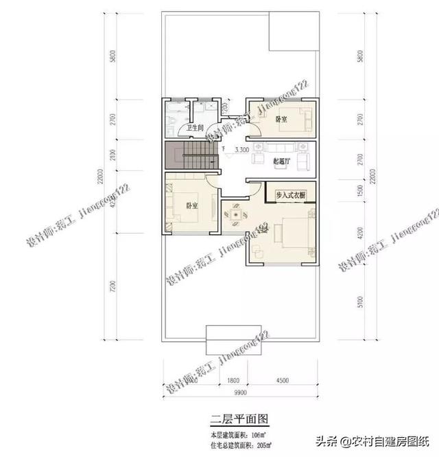 二层将主卧室。设计在南侧,次卧和卫生间设计有北侧。