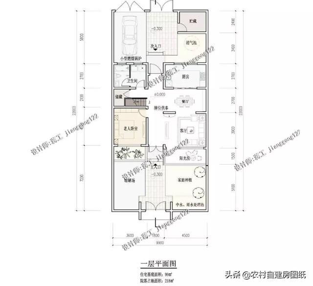 首层将老人房和客厅布置在阳光充裕的南向,厨房、卫生间等功能布置在北面,构成防寒空间。