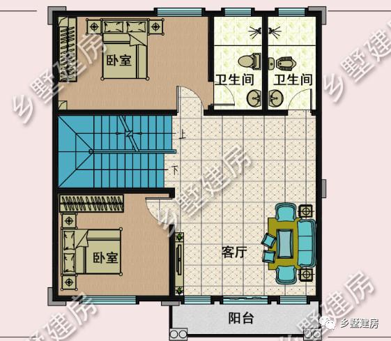 二层设计了两间卧室,一个客厅,一个公卫。上方的卧室内有独卫,方便起居。