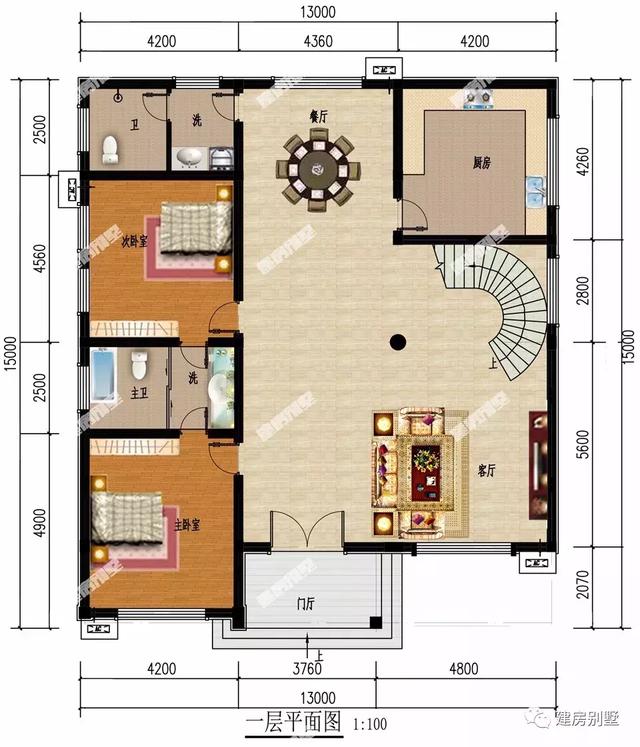 13×15米,占地面积187.99平方米,建筑面积447.58平方米,砖混结构,外墙面用真石漆和面砖装饰,屋面盖红瓦,配落地窗。