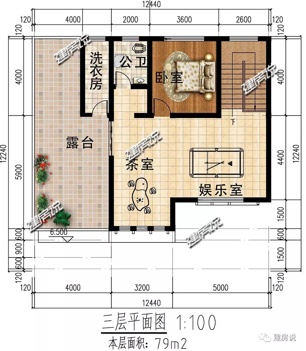 三层:1卧室;1公卫;茶室和娱乐室提供娱乐场所,促进家人交流;露台面积宽敞,便于日常晾晒、休闲活动等。