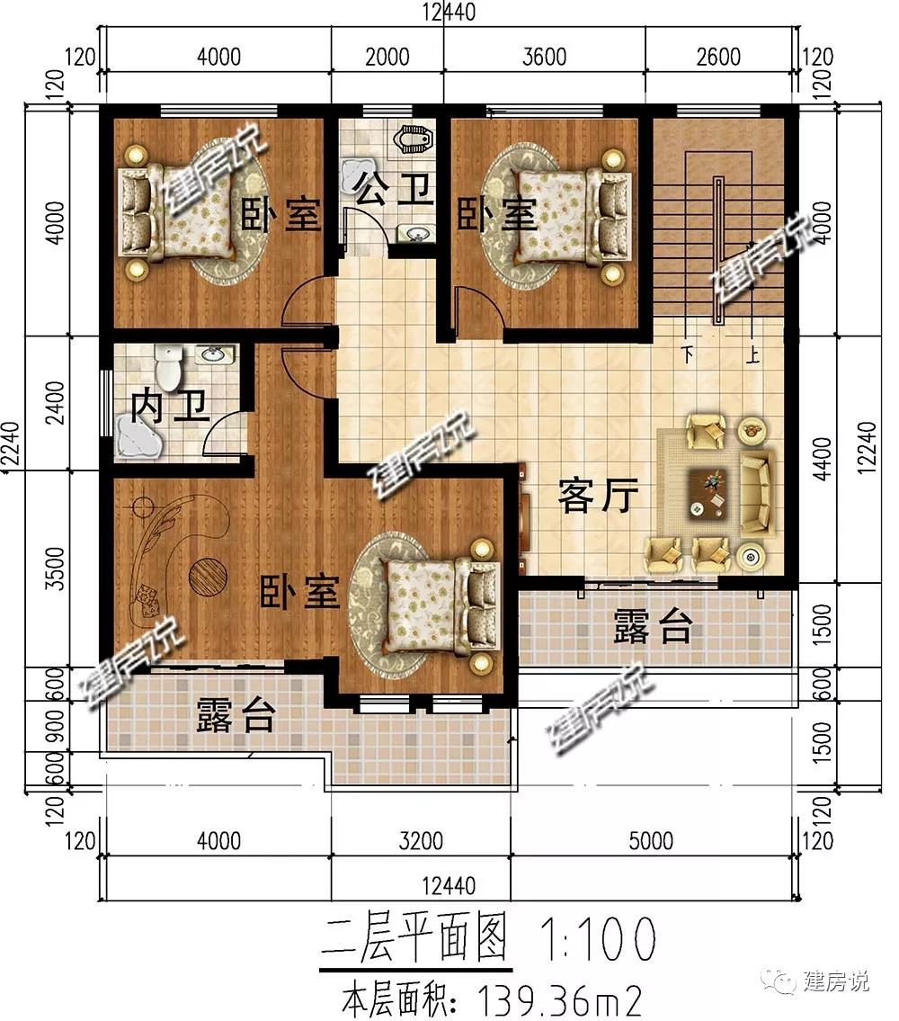 二层:设有3个卧室;露台让观景晾晒两不误;客厅便于家人之间联络感情。