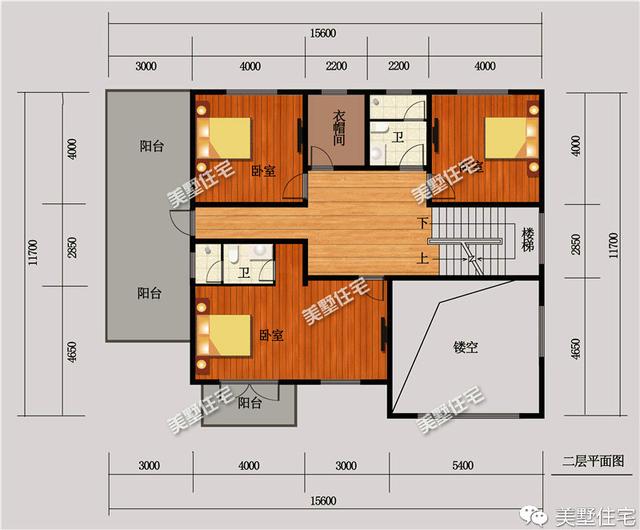 二层:设计功能:三个卧室房间设置充裕,两个卫生间,一个衣帽间,空间宽敞。