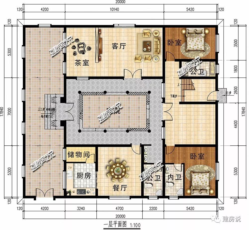 一层:入户屏风避免开门见山;宽敞庭院适合晾晒;茶室客厅适合接待好友,家庭休闲;设有2间卧室,主次分明;餐厅与厨房相连,干净卫生。