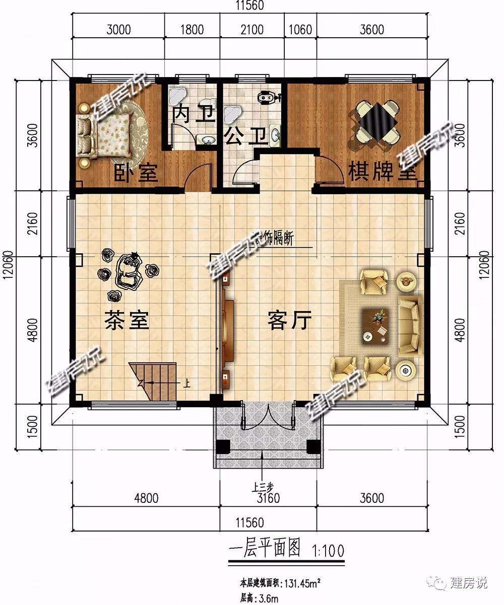 一层:入门设有隔断,避免开门见户;宽敞的客厅,可以接待客人;设有1间卧室;棋牌室可以平时放松娱乐;茶室可以喝喝茶,聊聊天。
