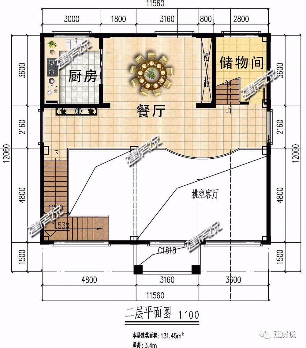 二层:厨房和餐厅相连,干净卫生;设有储物间,可以放置杂物,节省空间;挑空客厅的设计,可以和一楼的家人更好交流,增进感情,视野也更开阔。