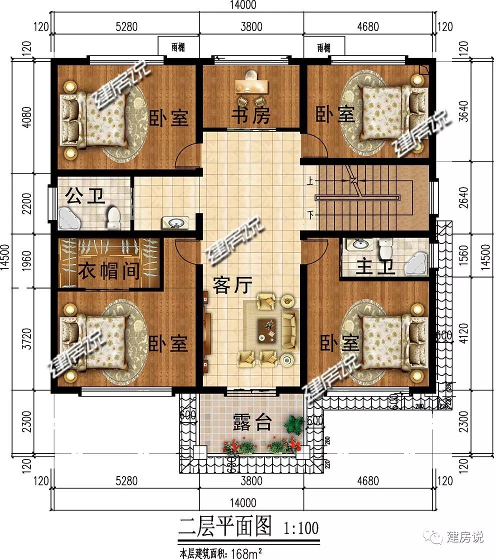 二层:设有4间卧室,主次分明;客厅与阳台相连,保证充足的采光;设有书房,适合学习办公。
