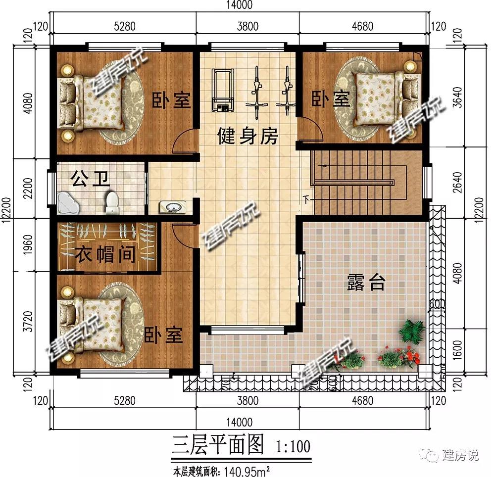 三层:设有3间卧室,主次分明;健身房可供家人娱乐;宽敞露台适合养殖花草,晾晒衣物。