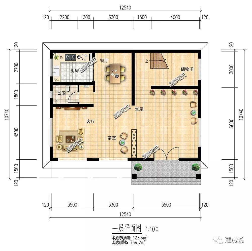 一层:1客厅宽敞舒适,1茶室促进家人交流;餐厅与厨房相连;1公卫;储物间释放更多空间,让家里更干净。