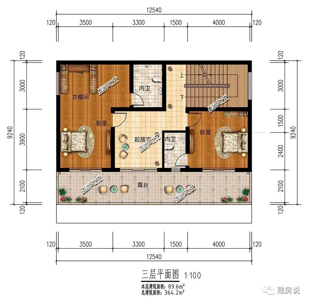 三层:2卧室,2内卫,主次分明;起居室提供日常休闲互动的场所,促进家人之间的交流;露台面积宽敞,便于日常晾晒、休闲活动等。
