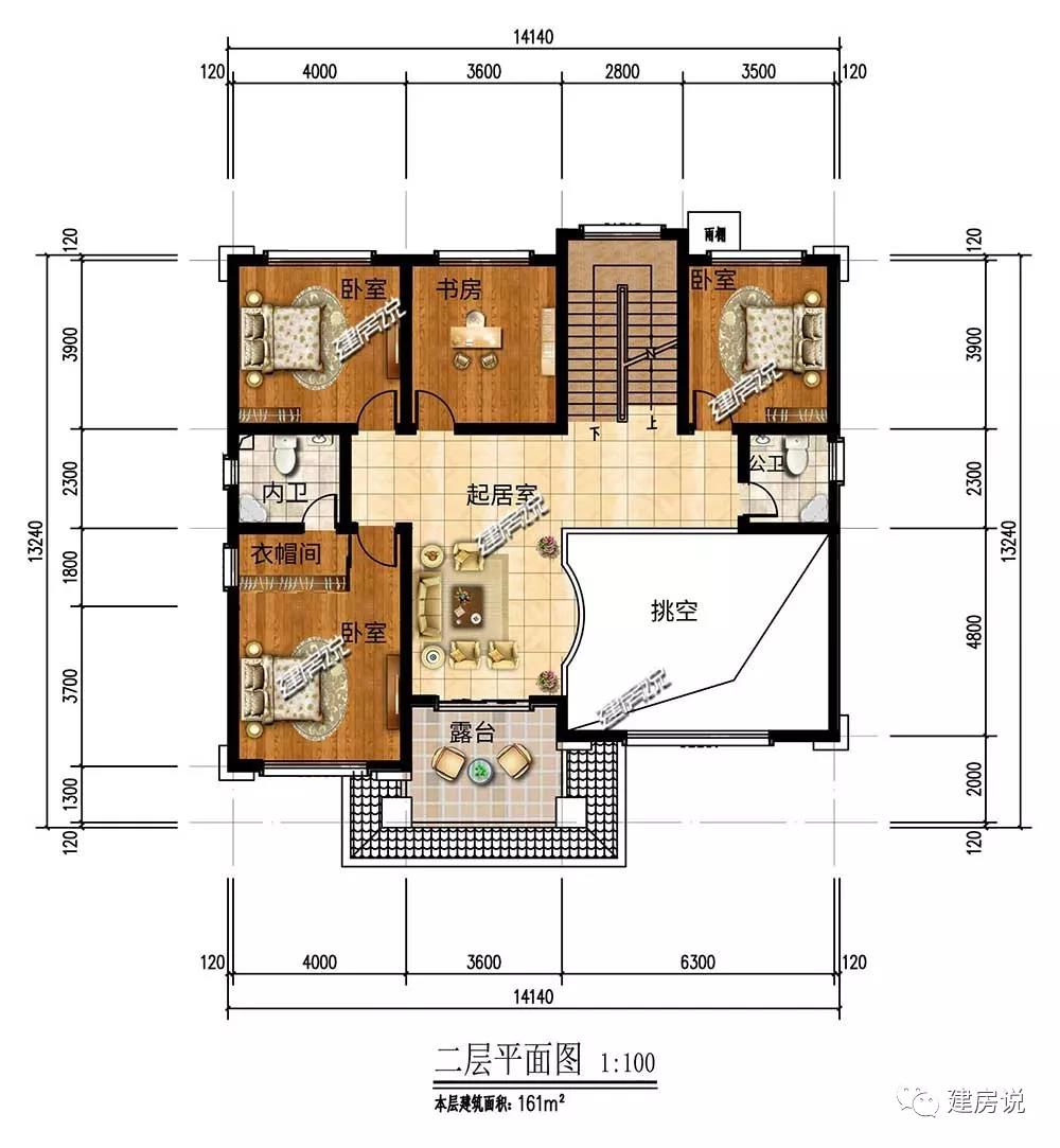 二层:挑空客厅尽显豪宅范;起居室与露台相连,光线充足方便家人日常活动;设有3间卧室,主次分明;书房适合办公学习。