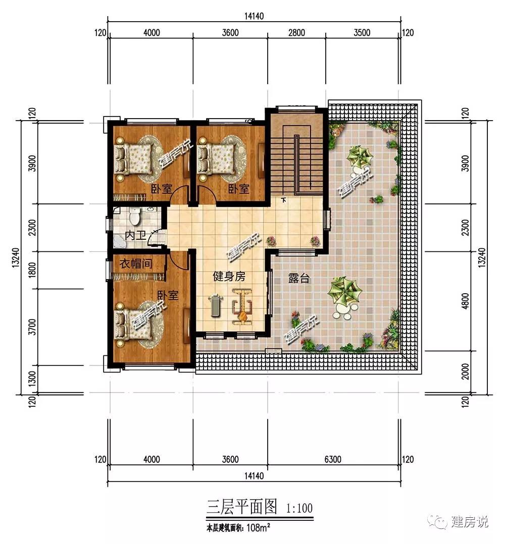 三层:设有3间卧室,主次分明;健身房帮助家人锻炼身体;宽敞露台适合晾晒衣物,养殖花草。
