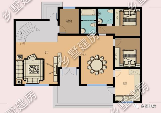 一层:设计了客厅、玄关、餐厅、厨房、两间卧室、公卫、储物间。