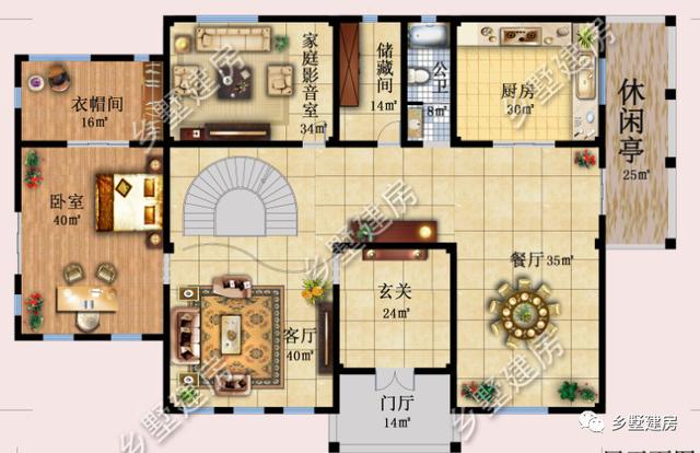一层:设计了一间套房,影音室,储藏间,公卫,厨房,餐厅,玄关,客厅,休闲亭。套房内带有独卫,可作为老人房使用。