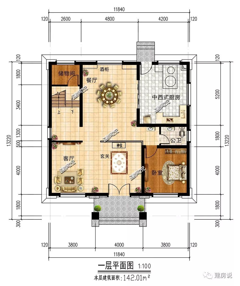 一层:入户设有玄关,客厅温馨舒适;厨房餐厅划分一侧,还设酒柜,提升居家品位。