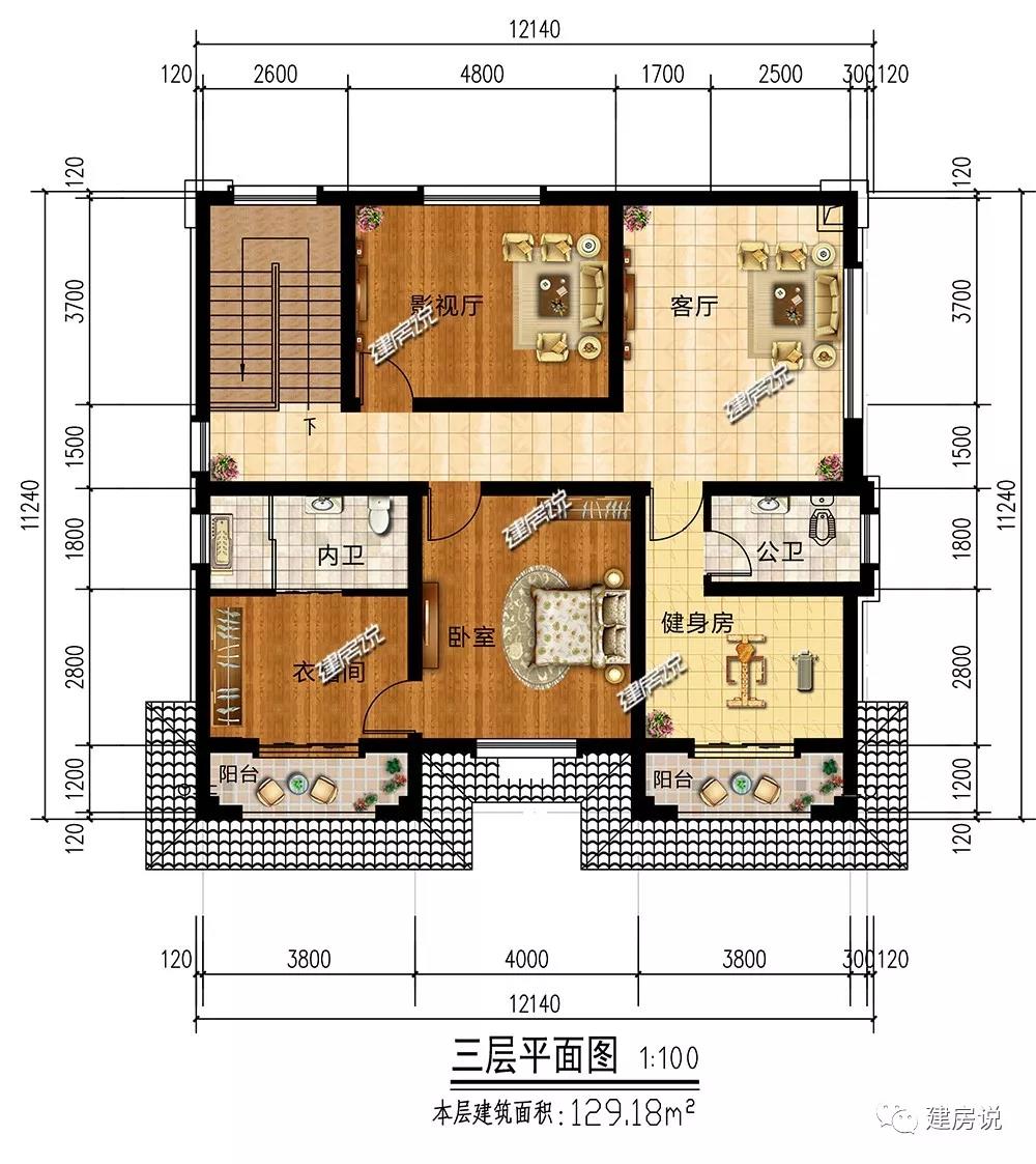 三层:1间卧室,带有衣帽间,居住便利;健身房、影视厅的设计,强身健体且丰富家居生活。