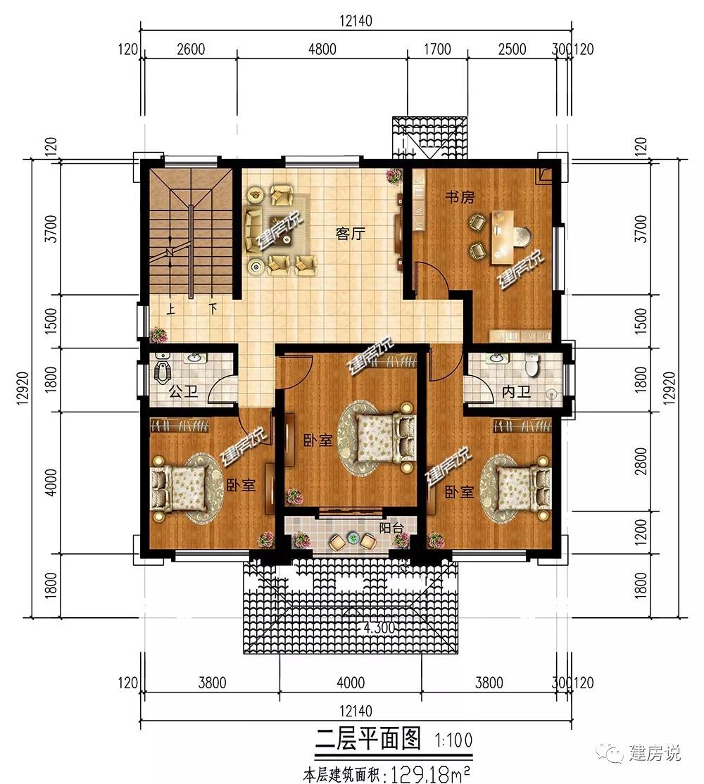 二层:3个卧室布局合理;书房给家人提供一个良好的学习工作环境;客厅方便家人联络感情。