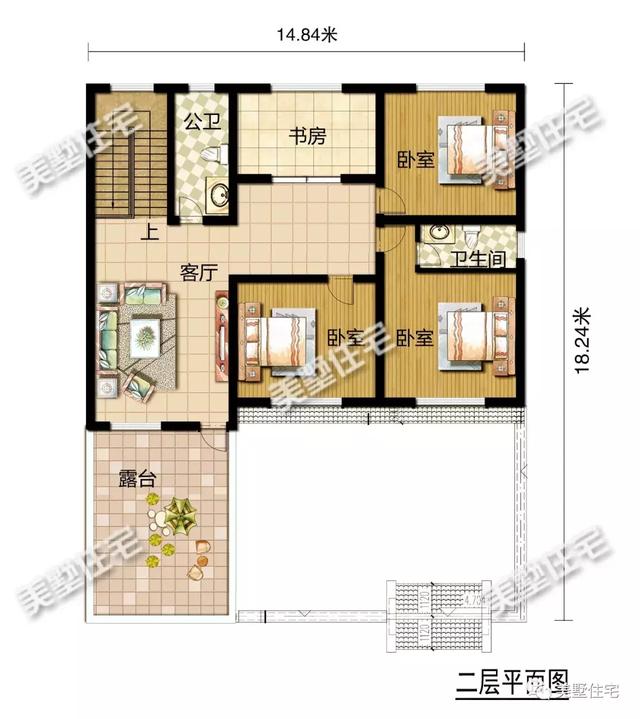 二层:设客厅、书房、三间卧室、两间卫生间、一个露台。