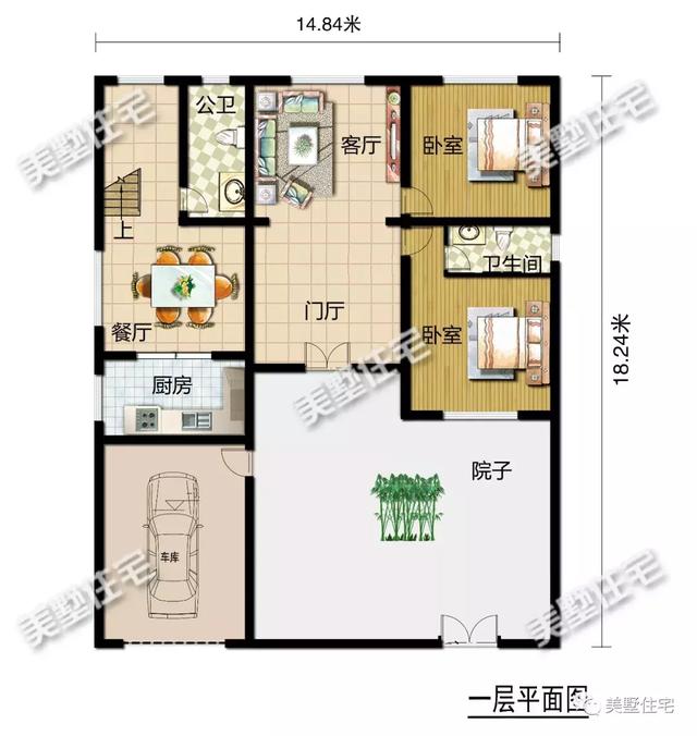 一层设:院子、车库、门厅、客厅、餐厅、厨房、两间卧室、两间卫生间。