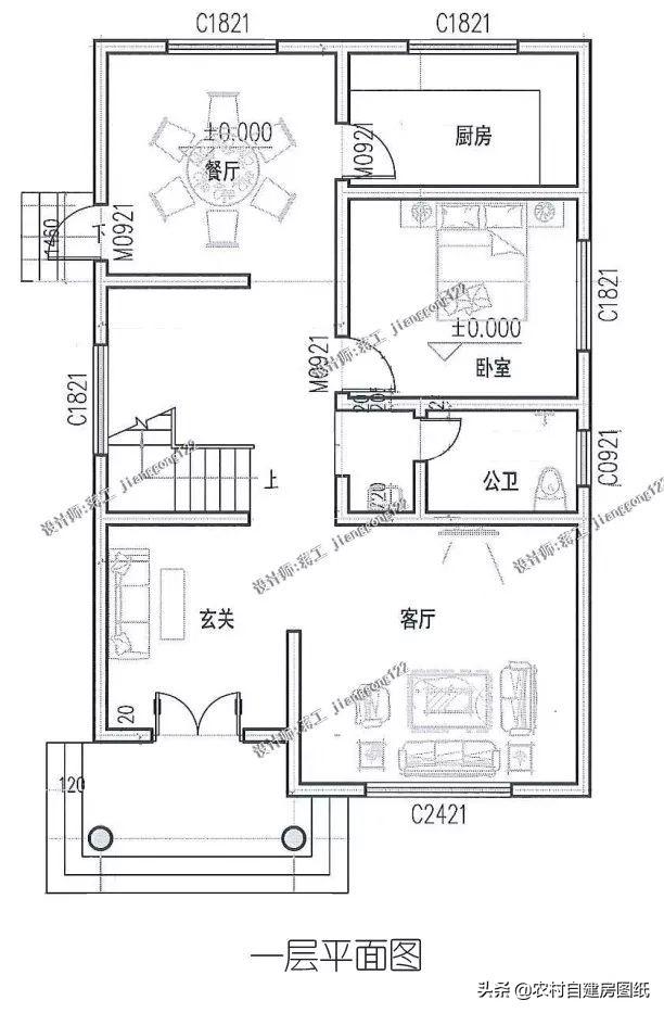 户型:开间只有8米,做成了4×4米的格局。进门是玄关,可以根据农村当地生活特色设计堂屋,玄关和复式客厅一体,使空间感更开阔。厨房和餐厅设计在北向,有侧门方便出入,一楼还设计有一间卧室,在中间位置,相对安静舒适。