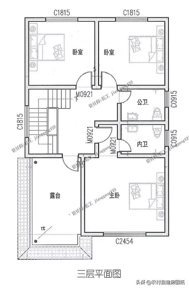 三层:设计有三间卧室二个卫生间,宽敞的屋顶露台,可以晾晒,可以观景,还可以做阳光房,与暖阳亲密接触。