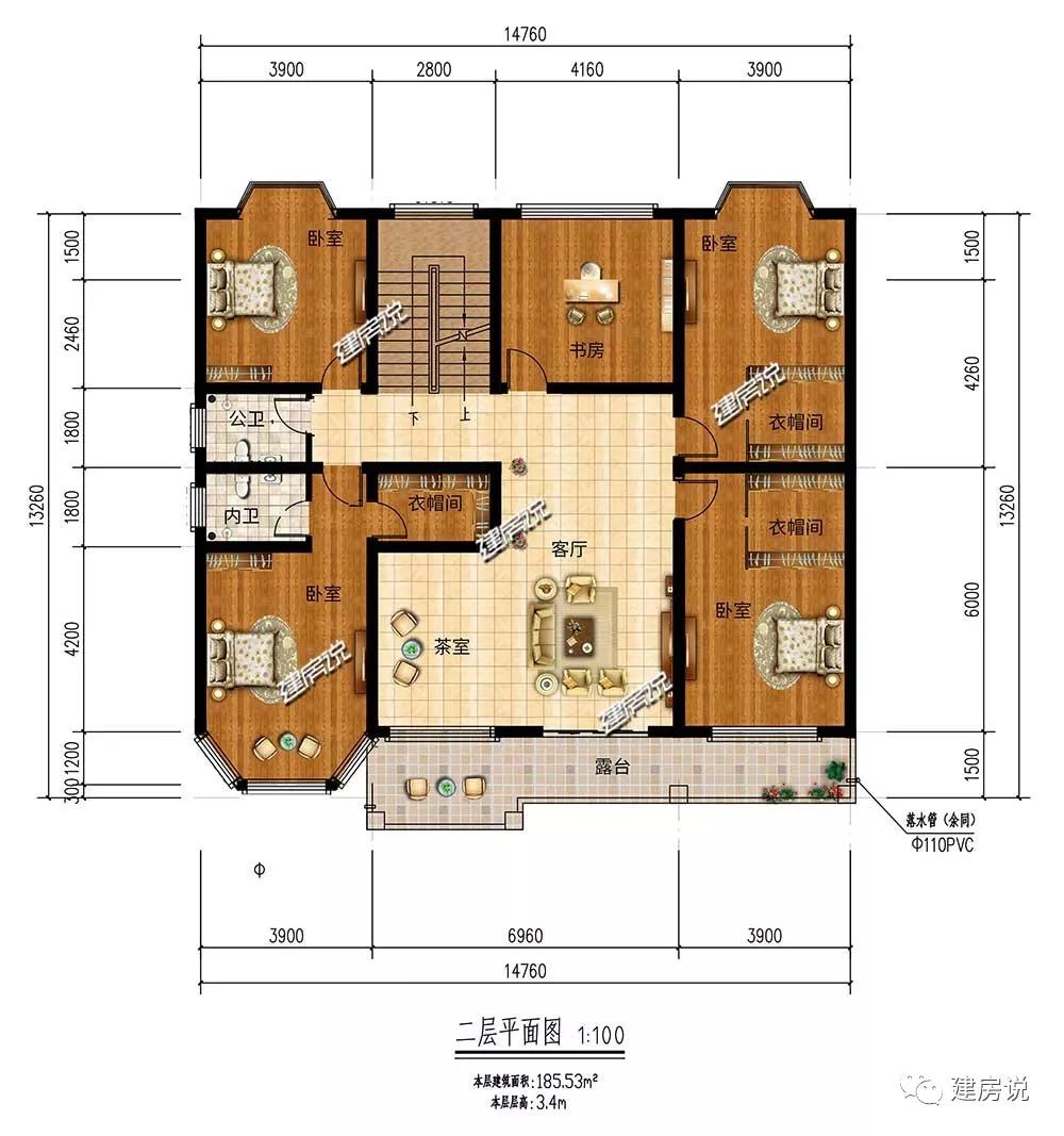 二层:卧室设置充裕;茶室的设计,提升家居品位;设置了1间书房,为家人学习工作提供一个安静的环境。