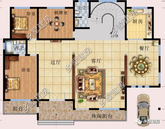 一层:设计了两间卧室,玄关,客厅,餐厅,厨房,棋牌室,公卫。