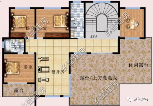 三层:设计了三间卧室,一间书房,一个健身房以及一个特别大鹅露台。
