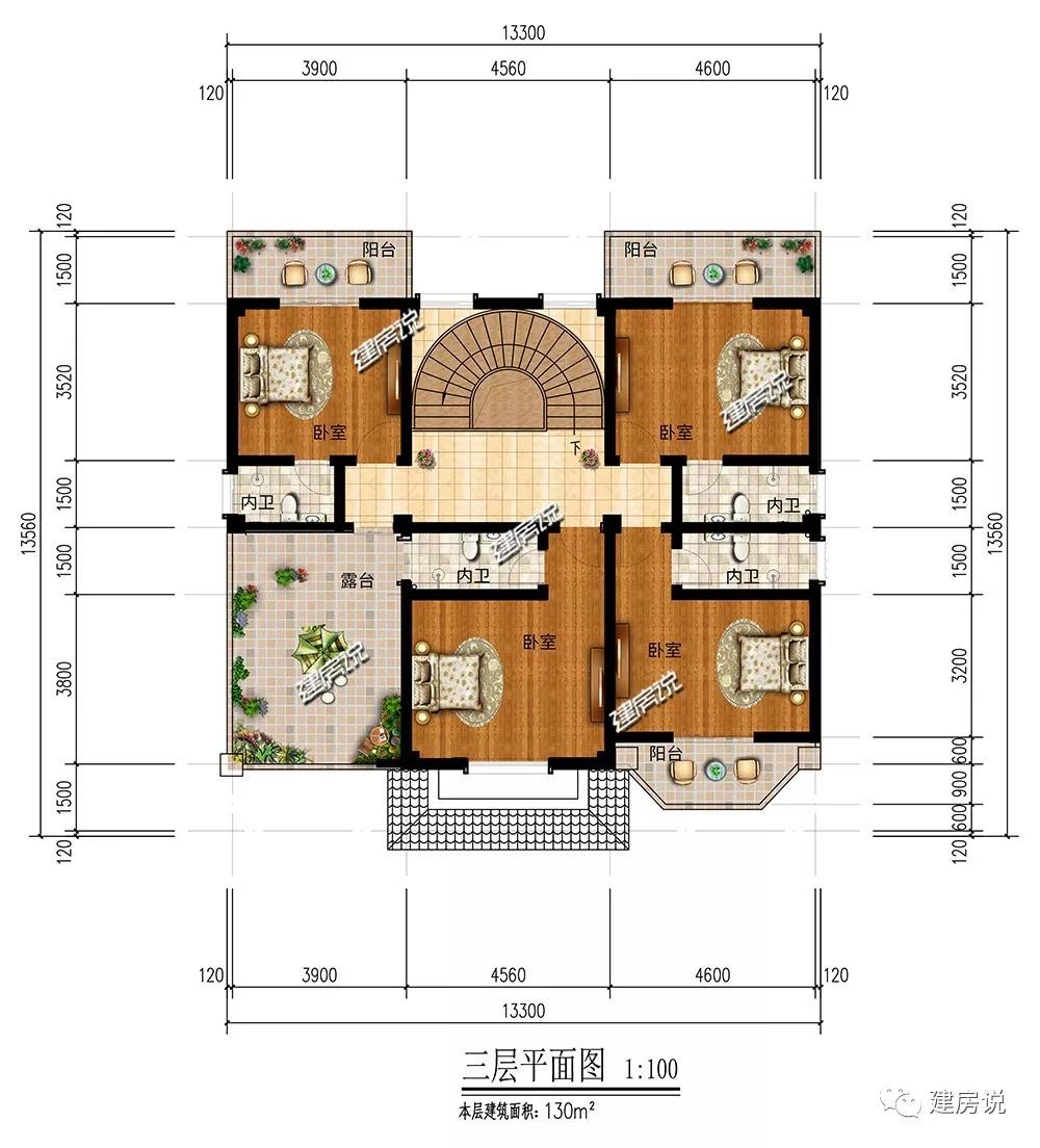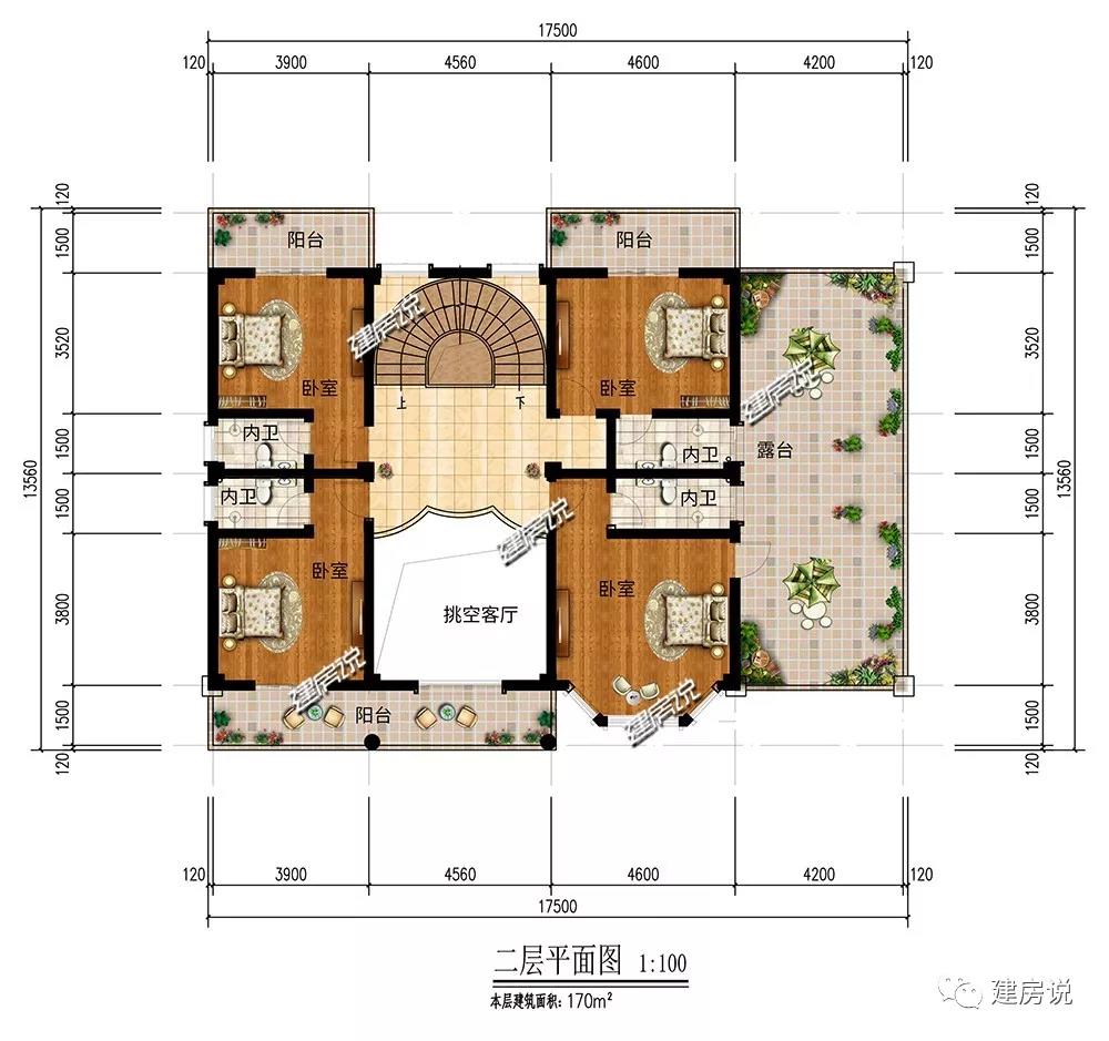 二层:设有4间卧室,并都设有卫生间,方便又舒适;挑空客厅让室内更加通透,采光更加明亮;露台可供晾晒。