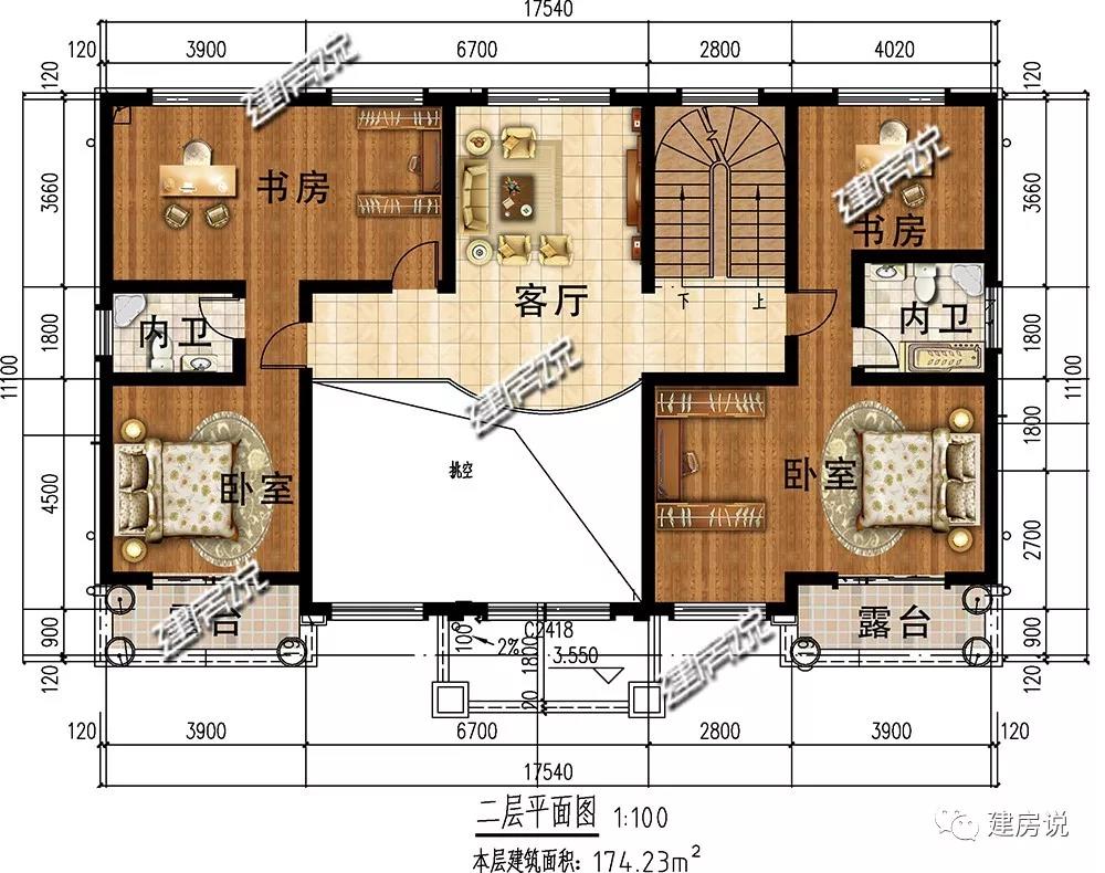 二层:挑空的设计加大房屋的空间感;2卧室均带书房,便于工作或学习,提升居住舒适度。