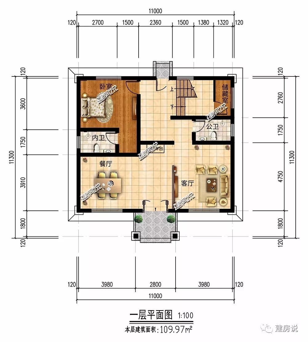 一层:入户设有神台,符合农村风俗习惯;客厅温馨舒适;厨房单独建造,洁污分离;储藏室方便储存杂物。