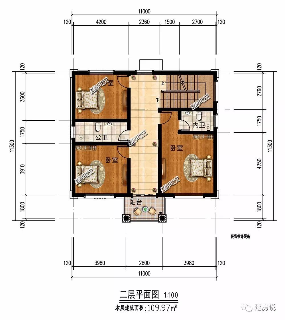 二层:3个卧室布局合理,温馨紧凑;阳台的设计,利于通风采光、休闲观景等。