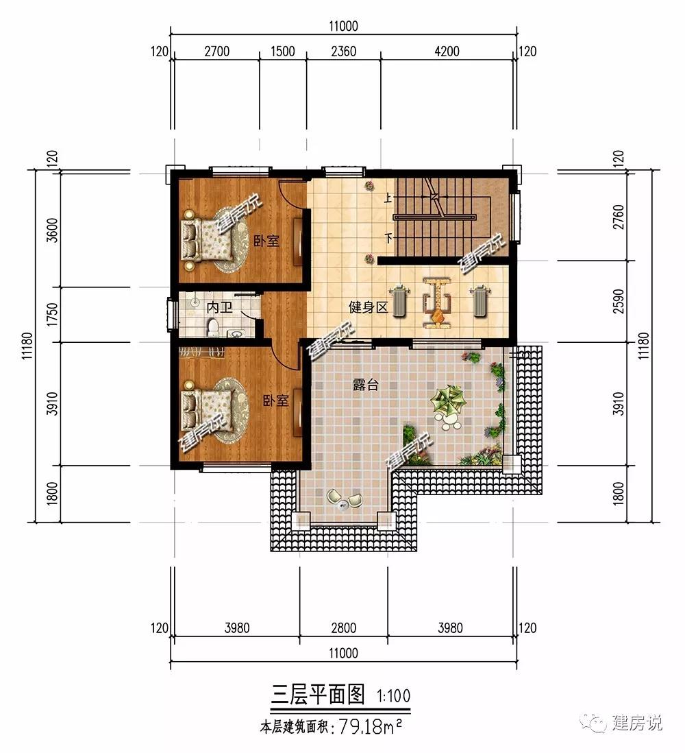 三层:除卧室外,还设有一个健身房,提升家人身体素质,养成健康的生活习惯;露台面积宽敞,可以打造成空中花园、露台烧烤等。